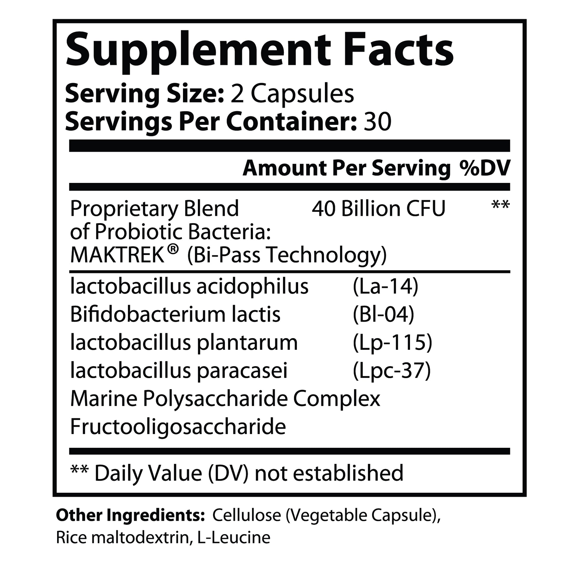MICHAEL DC™ Symbiotic 40 is a precision-formulated prebiotic and probiotic system designed to support digestive balance, microbial diversity, and immune function as part of daily wellness*. The formula is enhanced with MAKTREK® Marine Polysaccharide Complex—a naturally derived marine carbohydrate matrix included to help protect and support probiotic stability as the capsules pass through stomach acid and the digestive tract, without relying on harsh enteric coatings or synthetic delivery systems*.