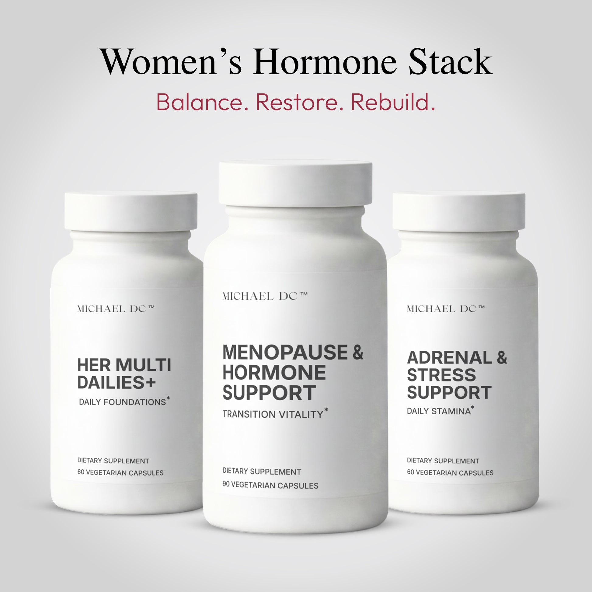 This comprehensive system is designed for women experiencing monthly fluctuations, estrogen–progesterone imbalance, stress-related hormonal shifts, or transitional changes through perimenopause and menopause. The stack combines a foundational multivitamin, targeted hormone-support nutrients, and adrenal adaptogens to help maintain a steady endocrine rhythm through cycles, lifestyle stressors, and age-related changes.
